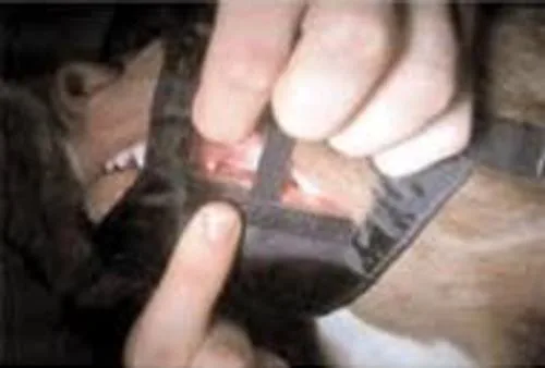 The C-Muzzle was developed by a veterinarian. It has Velcro flaps on both sides of the jaw to allow visualization and access to the patient’s mouth.