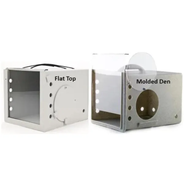 The Flat-Top version of this feral cat den provides an elevated perch for cats to sit on. Unit comes complete with front/side doors and locking pin. The Molded Handle version also comes complete with front/side doors, and has a lifetime warranty on the den only (warranty does not include front or side doors or any moving parts). The Molded Handle den does not require a locking pin. Replacement parts can be ordered separately.